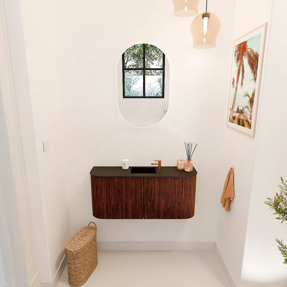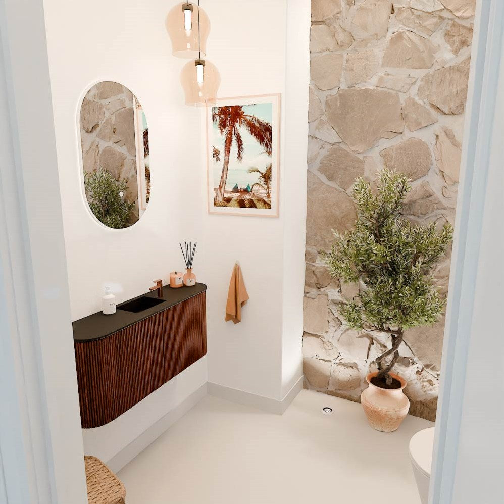 JOYA 93,2cm toiletmeubel ronding links + rechts kleur Ruby. Wastafel FAYE positie Midden 1 kraangat kleur Urban.