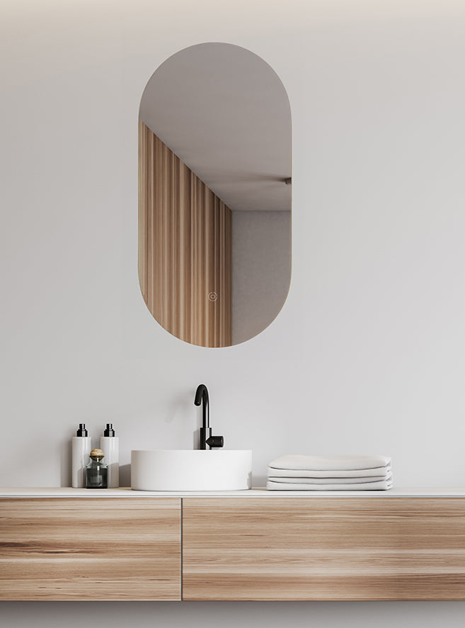 Lumia spiegel ovaal met LED, dimbaar en spiegelverwarming 50 x 100 cm Lumia is de revolutionaire nieuwe spiegel zonder lijst die iedere badkamer naar een hoger niveau tilt. Met zijn dimbare LED-verlichting en touch schakelaar biedt deze spiegel een unieke, aanpasbare verlichtingservaring. De lichtkleur kan traploos worden ingesteld tussen warm wit licht (3000K) en koud wit licht (6500K), waardoor je de perfecte sfeer kunt creëren voor elke gelegenheid. Maar dat is niet alles. Lumia heeft ook spiegelverwarming, zodat je nooit meer last hebt van condens en je altijd een heldere weergave van jezelf hebt. En met zijn IP44-classificatie is Lumia ook spatwaterdicht, waardoor je hem veilig in vochtige omgevingen kunt gebruiken. Bovendien is Lumia CE-gekeurd, wat betekent dat het voldoet aan de hoogste normen van kwaliteit en veiligheid. En met zijn verticale plaatsing is deze spiegel zonder lijst de perfecte aanvulling op elke badkamer of kleedkamer. Daarnaast schakelt de spiegel na 1 uur automatisch uit wat energiebesparend is! Ook is de Nomi spiegel is eenvoudig verticaal te plaatsen, waardoor je hem gemakkelijk kunt ophangen waar je maar wilt. Kortom, als je op zoek bent naar een spiegel die meer is dan alleen een reflectie en zonder lijst, dan is Lumia de juiste keuze voor jou. Met zijn aanpasbare verlichting, spiegelverwarming en spatwaterdichte ontwerp is Lumia de ultieme combinatie van stijl en functionaliteit. Wacht niet langer en ervaar zelf de magie van Lumia!
