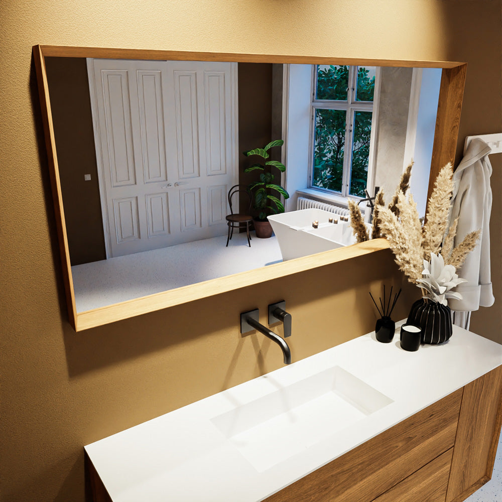 COFF, een mooie, moderne spiegel met een houtbruine omlijsting. De spiegel is verkrijgbaar in verschillende afmetingen en heeft een rechthoekige vorm.