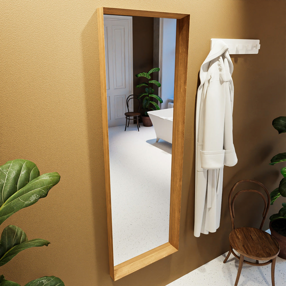 COFF, een mooie, moderne spiegel met een houtbruine omlijsting. De spiegel is verkrijgbaar in verschillende afmetingen en heeft een rechthoekige vorm.