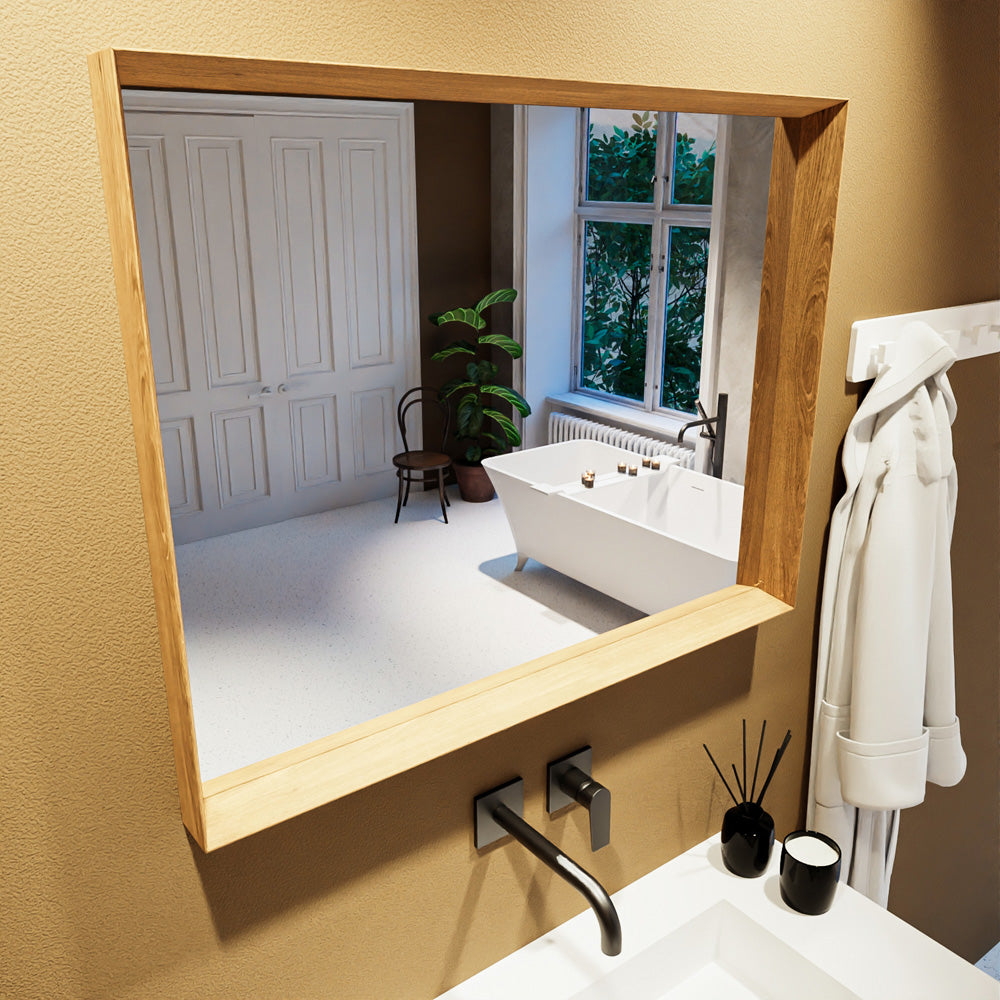 COFF, een mooie, moderne spiegel met een houtbruine omlijsting. De spiegel is verkrijgbaar in verschillende afmetingen en heeft een rechthoekige vorm.