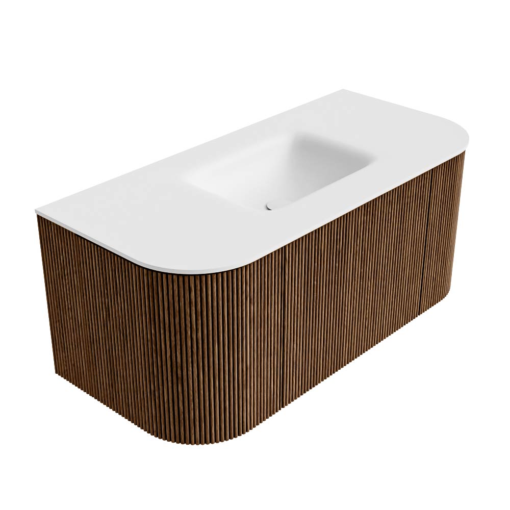 Het ultieme badmeubel dat je badkamer transformeert tot een oase van verfijning. Met zijn halfronde, verticale stroken van massief eiken, verkrijgbaar in de kleuren Oak en Walnut, straalt KURVE vakmanschap uit in elk detail. De zachte rondingen en slim ontworpen deurtjes, elk 40cm hoog, nodigen uit tot gebruik, terwijl de ruimte binnenin optimaal benut wordt dankzij de royale lade van dezelfde hoogte.