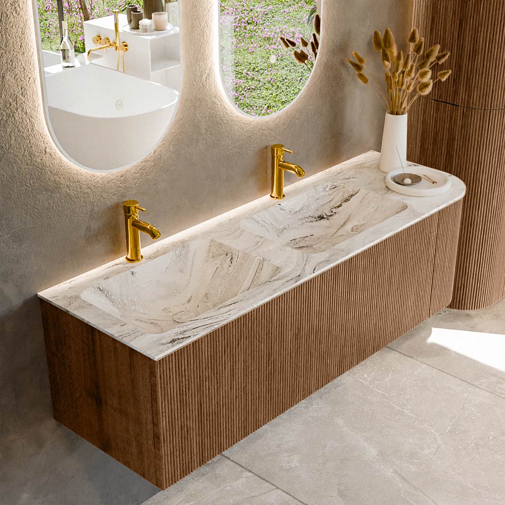 Het ultieme badmeubel dat je badkamer transformeert tot een oase van verfijning. Met zijn halfronde, verticale stroken van massief eiken, verkrijgbaar in de kleuren Oak en Walnut, straalt KURVE vakmanschap uit in elk detail. De zachte rondingen en slim ontworpen deurtjes, elk 40cm hoog, nodigen uit tot gebruik, terwijl de ruimte binnenin optimaal benut wordt dankzij de royale lade van dezelfde hoogte.