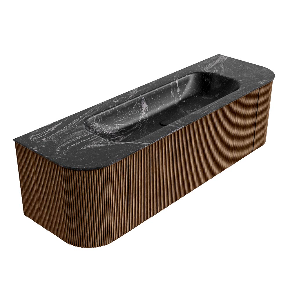 MONDIAZ KURVE-DLUX 150cm badmeubel ronding Links + Rechts kleur Walnut met 1 lade en 2 deuren. Wastafel BIG MEDIUM Midden 1 kraangat Lava.