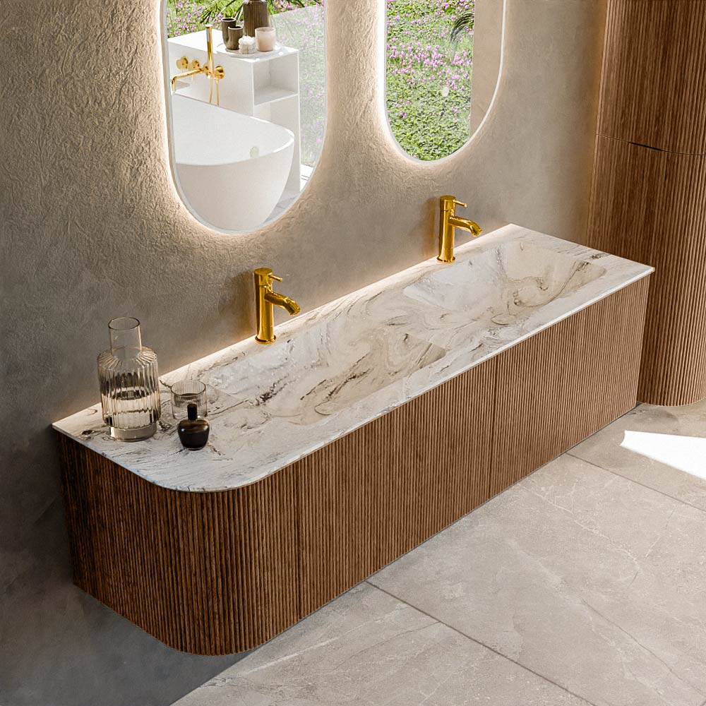 Het ultieme badmeubel dat je badkamer transformeert tot een oase van verfijning. Met zijn halfronde, verticale stroken van massief eiken, verkrijgbaar in de kleuren Oak en Walnut, straalt KURVE vakmanschap uit in elk detail. De zachte rondingen en slim ontworpen deurtjes, elk 40cm hoog, nodigen uit tot gebruik, terwijl de ruimte binnenin optimaal benut wordt dankzij de royale lade van dezelfde hoogte.