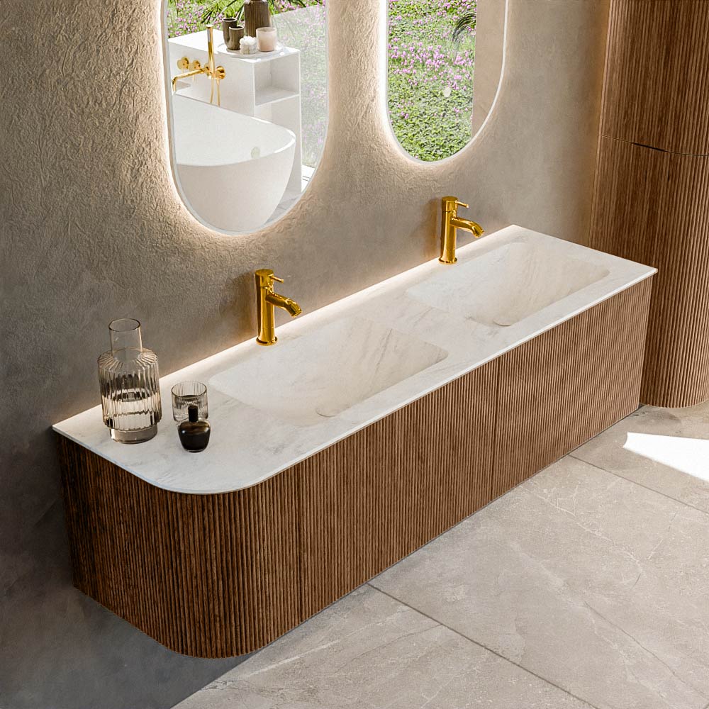 Het ultieme badmeubel dat je badkamer transformeert tot een oase van verfijning. Met zijn halfronde, verticale stroken van massief eiken, verkrijgbaar in de kleuren Oak en Walnut, straalt KURVE vakmanschap uit in elk detail. De zachte rondingen en slim ontworpen deurtjes, elk 40cm hoog, nodigen uit tot gebruik, terwijl de ruimte binnenin optimaal benut wordt dankzij de royale lade van dezelfde hoogte.