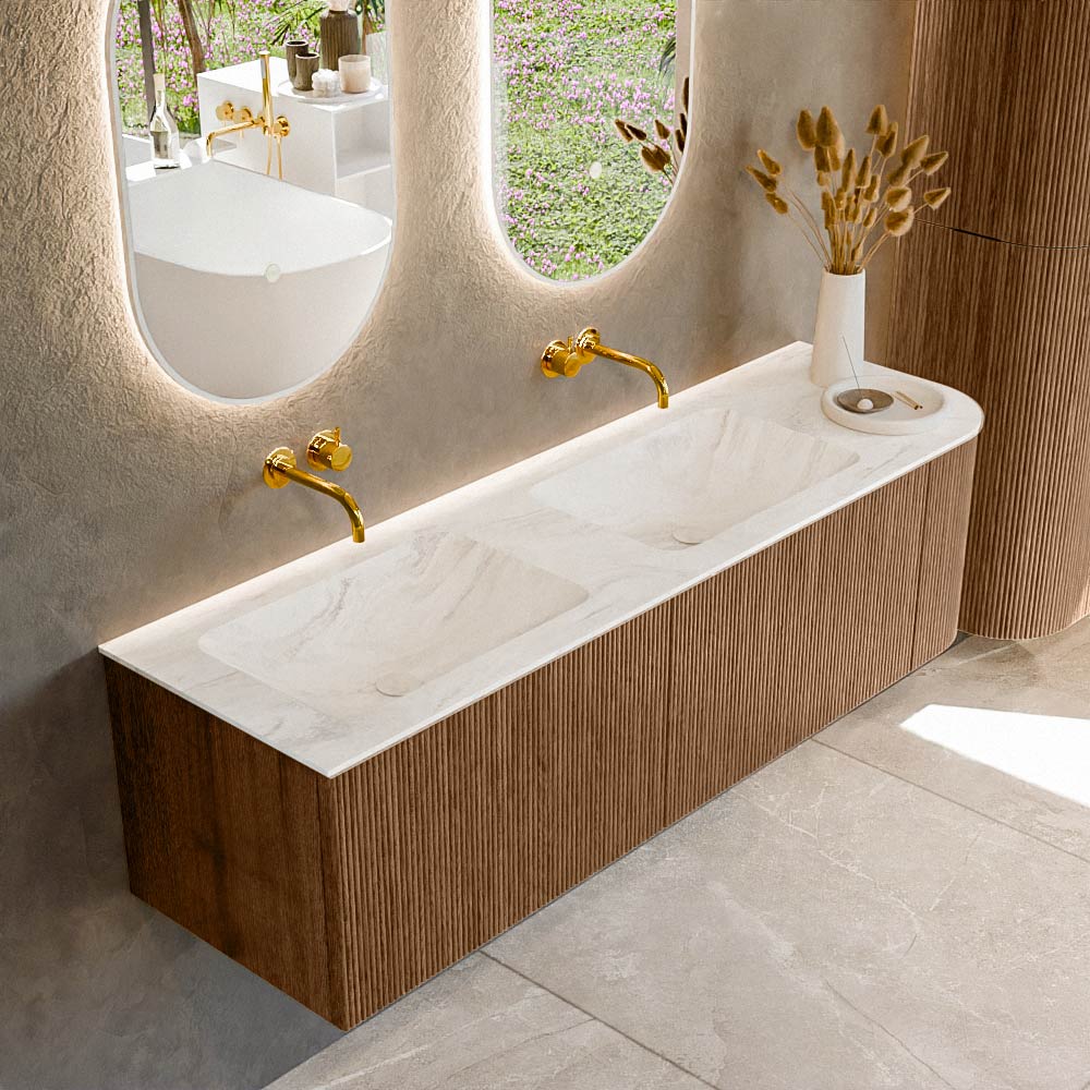 Het ultieme badmeubel dat je badkamer transformeert tot een oase van verfijning. Met zijn halfronde, verticale stroken van massief eiken, verkrijgbaar in de kleuren Oak en Walnut, straalt KURVE vakmanschap uit in elk detail. De zachte rondingen en slim ontworpen deurtjes, elk 40cm hoog, nodigen uit tot gebruik, terwijl de ruimte binnenin optimaal benut wordt dankzij de royale lade van dezelfde hoogte.