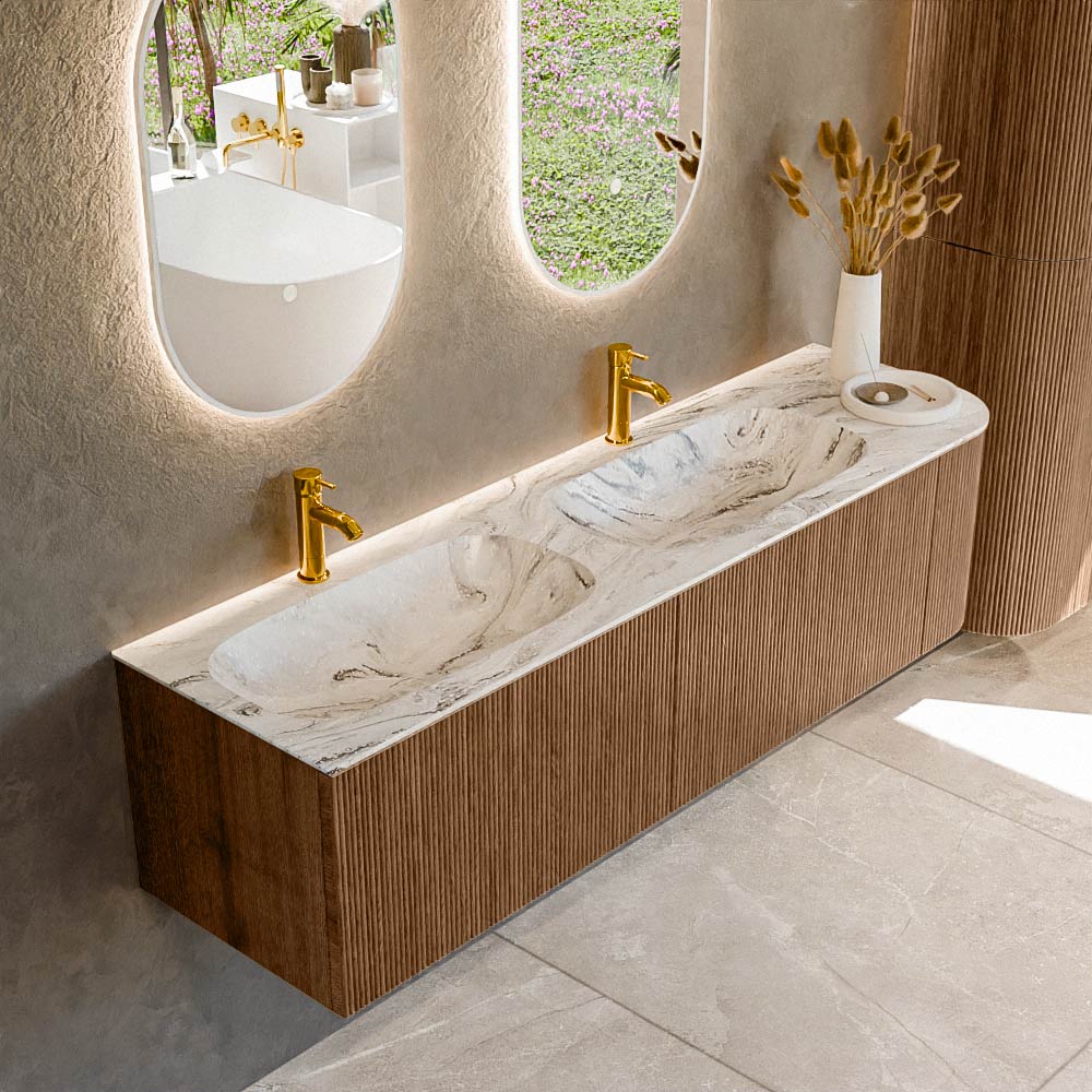 Het ultieme badmeubel dat je badkamer transformeert tot een oase van verfijning. Met zijn halfronde, verticale stroken van massief eiken, verkrijgbaar in de kleuren Oak en Walnut, straalt KURVE vakmanschap uit in elk detail. De zachte rondingen en slim ontworpen deurtjes, elk 40cm hoog, nodigen uit tot gebruik, terwijl de ruimte binnenin optimaal benut wordt dankzij de royale lade van dezelfde hoogte.