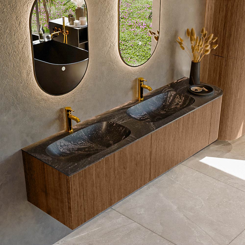 MONDIAZ KURVE-DLUX 175cm badmeubel ronding Rechts kleur Walnut met 2 lades en 1 deur. Wastafel STOR SMALL Dubbel / Links 2 kraangaten Lava.