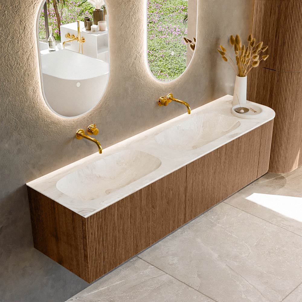 Het ultieme badmeubel dat je badkamer transformeert tot een oase van verfijning. Met zijn halfronde, verticale stroken van massief eiken, verkrijgbaar in de kleuren Oak en Walnut, straalt KURVE vakmanschap uit in elk detail. De zachte rondingen en slim ontworpen deurtjes, elk 40cm hoog, nodigen uit tot gebruik, terwijl de ruimte binnenin optimaal benut wordt dankzij de royale lade van dezelfde hoogte.
