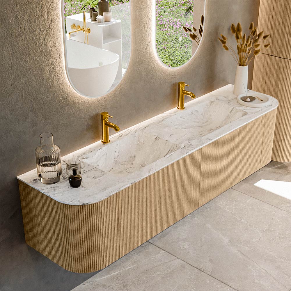 MONDIAZ KURVE-DLUX 180cm badmeubel ronding Links + Rechts kleur Oak met 2 lades en 2 deuren. Wastafel LEAF Dubbel 2 kraangaten Glace.