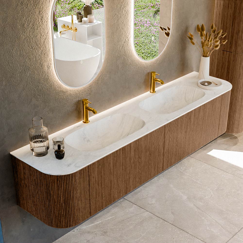 Het ultieme badmeubel dat je badkamer transformeert tot een oase van verfijning. Met zijn halfronde, verticale stroken van massief eiken, verkrijgbaar in de kleuren Oak en Walnut, straalt KURVE vakmanschap uit in elk detail. De zachte rondingen en slim ontworpen deurtjes, elk 40cm hoog, nodigen uit tot gebruik, terwijl de ruimte binnenin optimaal benut wordt dankzij de royale lade van dezelfde hoogte.