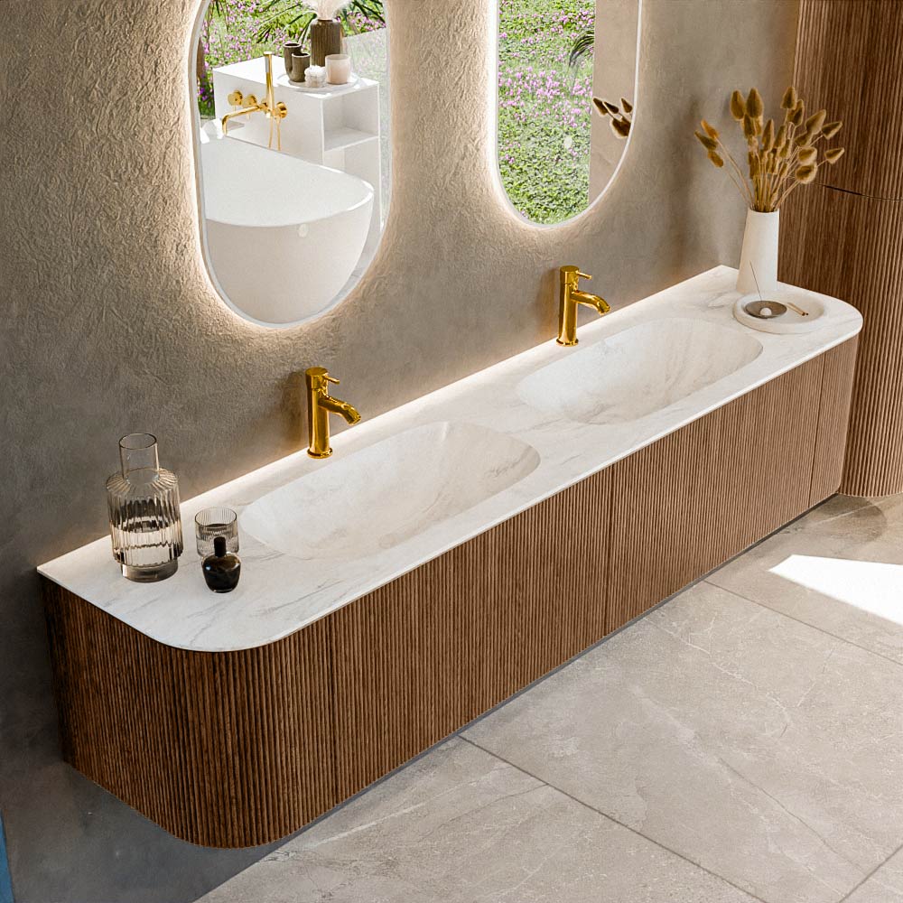 MONDIAZ KURVE-DLUX 200cm badmeubel ronding Links + Rechts kleur Walnut met 2 lades en 2 deuren. Wastafel STOR SMALL Dubbel 2 kraangaten Ostra.