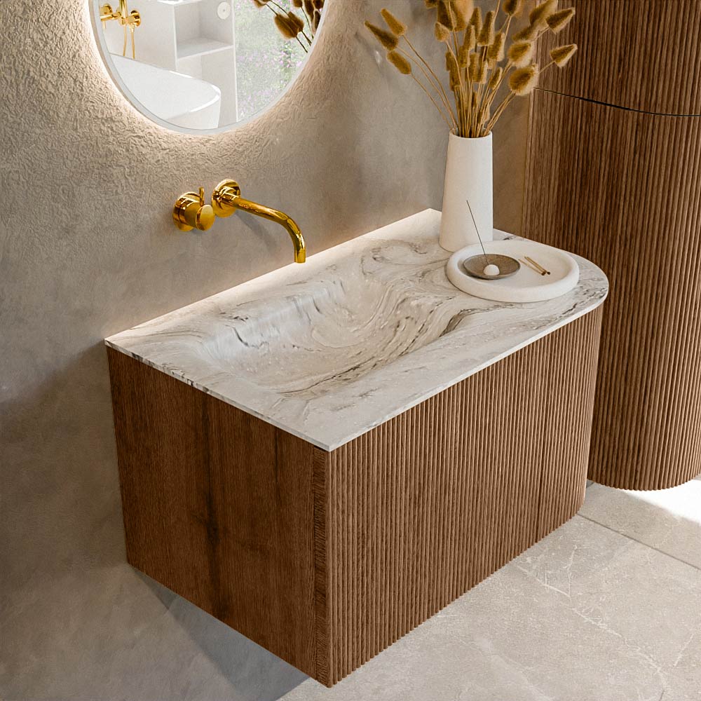 MONDIAZ KURVE-DLUX 75cm badmeubel ronding Rechts kleur Walnut met 1 lade en 1 deur. Wastafel GRUNNE Links zonder kraangat Glace.