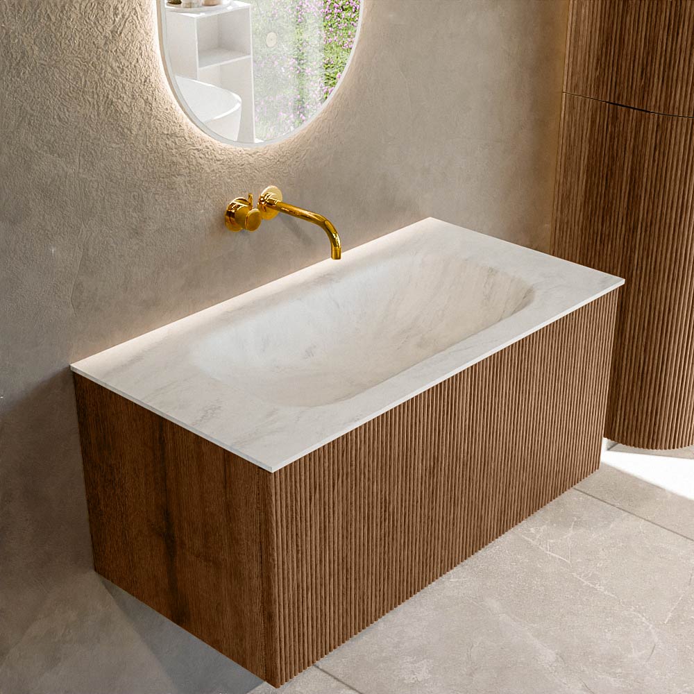 MONDIAZ KURVE-DLUX 90cm badmeubel kleur Walnut met 1 lade en 0 deuren. Wastafel BIG SMALL Midden zonder kraangat Opalo.
