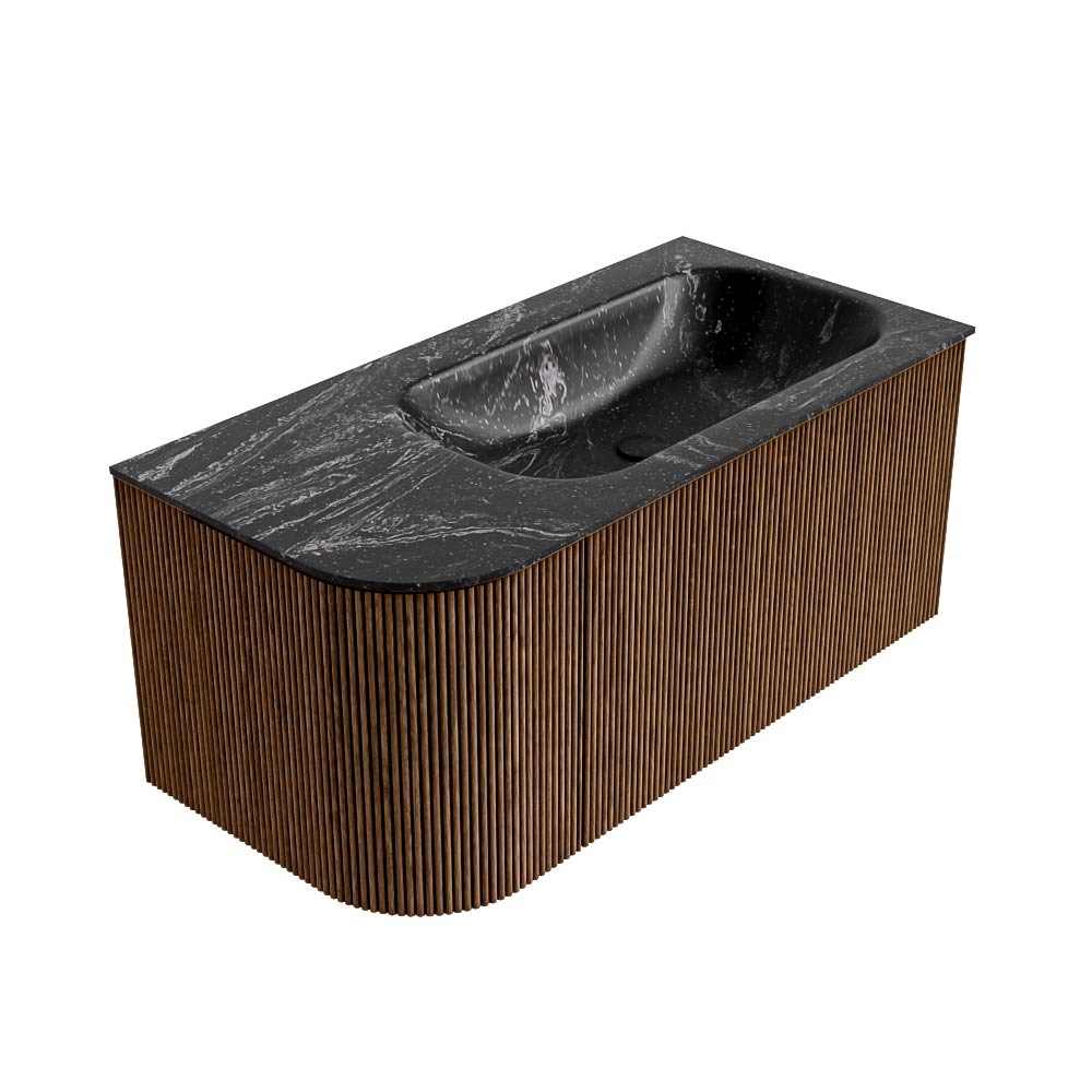 MONDIAZ KURVE-DLUX 95cm badmeubel ronding Links kleur Walnut met 1 lade en 1 deur. Wastafel BIG SMALL Rechts zonder kraangat Lava.