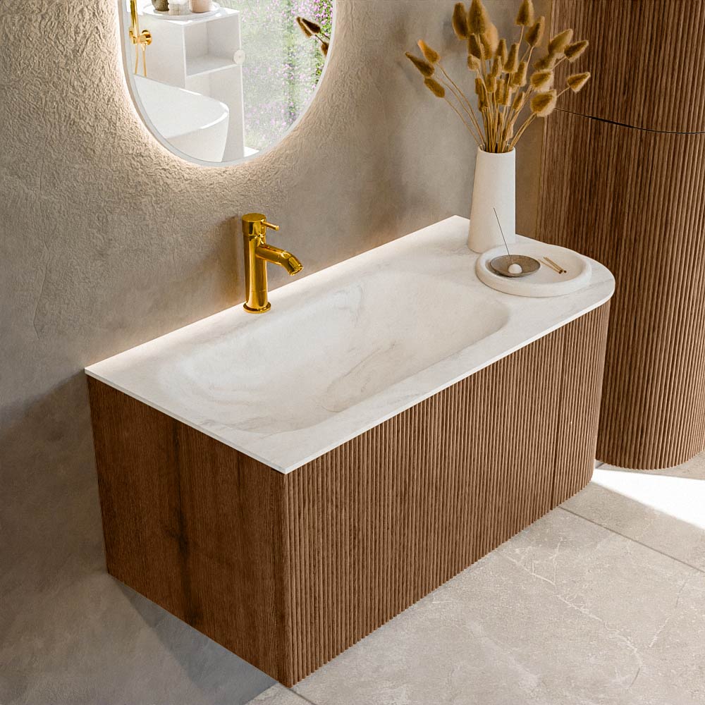 MONDIAZ KURVE-DLUX 95cm badmeubel ronding Rechts kleur Walnut met 1 lade en 1 deur. Wastafel BIG SMALL Links 1 kraangat Ostra.