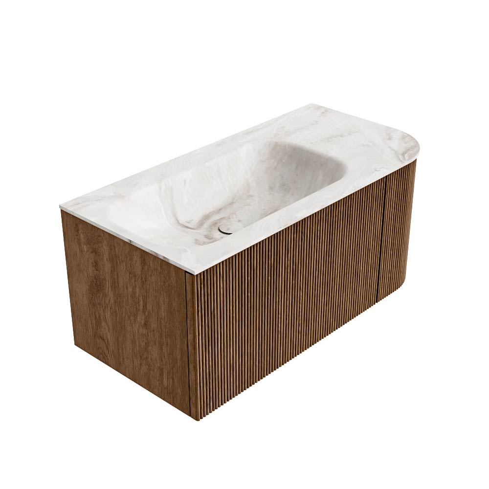 Het ultieme badmeubel dat je badkamer transformeert tot een oase van verfijning. Met zijn halfronde, verticale stroken van massief eiken, verkrijgbaar in de kleuren Oak en Walnut, straalt KURVE vakmanschap uit in elk detail. De zachte rondingen en slim ontworpen deurtjes, elk 40cm hoog, nodigen uit tot gebruik, terwijl de ruimte binnenin optimaal benut wordt dankzij de royale lade van dezelfde hoogte.