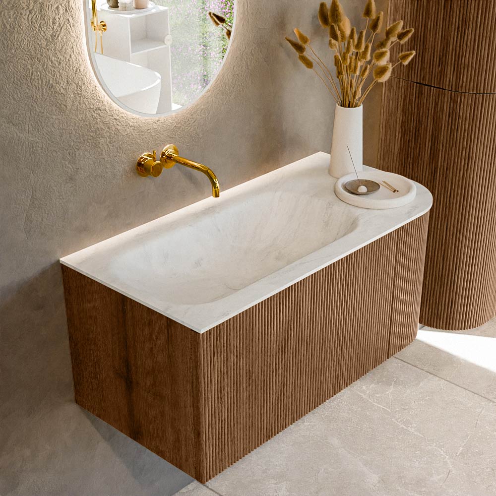 Het ultieme badmeubel dat je badkamer transformeert tot een oase van verfijning. Met zijn halfronde, verticale stroken van massief eiken, verkrijgbaar in de kleuren Oak en Walnut, straalt KURVE vakmanschap uit in elk detail. De zachte rondingen en slim ontworpen deurtjes, elk 40cm hoog, nodigen uit tot gebruik, terwijl de ruimte binnenin optimaal benut wordt dankzij de royale lade van dezelfde hoogte.