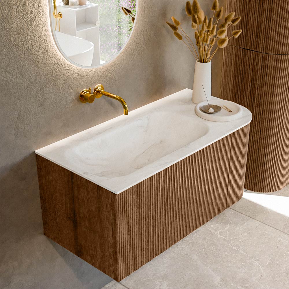 Het ultieme badmeubel dat je badkamer transformeert tot een oase van verfijning. Met zijn halfronde, verticale stroken van massief eiken, verkrijgbaar in de kleuren Oak en Walnut, straalt KURVE vakmanschap uit in elk detail. De zachte rondingen en slim ontworpen deurtjes, elk 40cm hoog, nodigen uit tot gebruik, terwijl de ruimte binnenin optimaal benut wordt dankzij de royale lade van dezelfde hoogte.