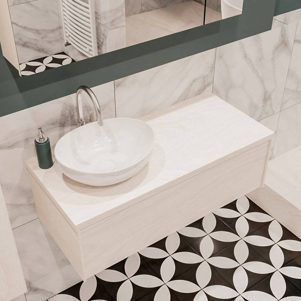 De LUSH meubelset is verkrijgbaar in 4 prachtige melamine kleuren, die een warme en natuurlijke uitstraling toevoegen aan je badkamer. In de LUSH serie heb je de keuze tussen 1 of 2 lades en kun je kiezen tussen een wastafel of waskom. Daarnaast is het mogelijk om te kiezen voor wel of geen kraangat en de positie van de wastafel/waskom. Deze serie biedt daarmee veelzijdige opties om het badmeubel aan te passen aan jouw specifieke behoeften en smaak.
