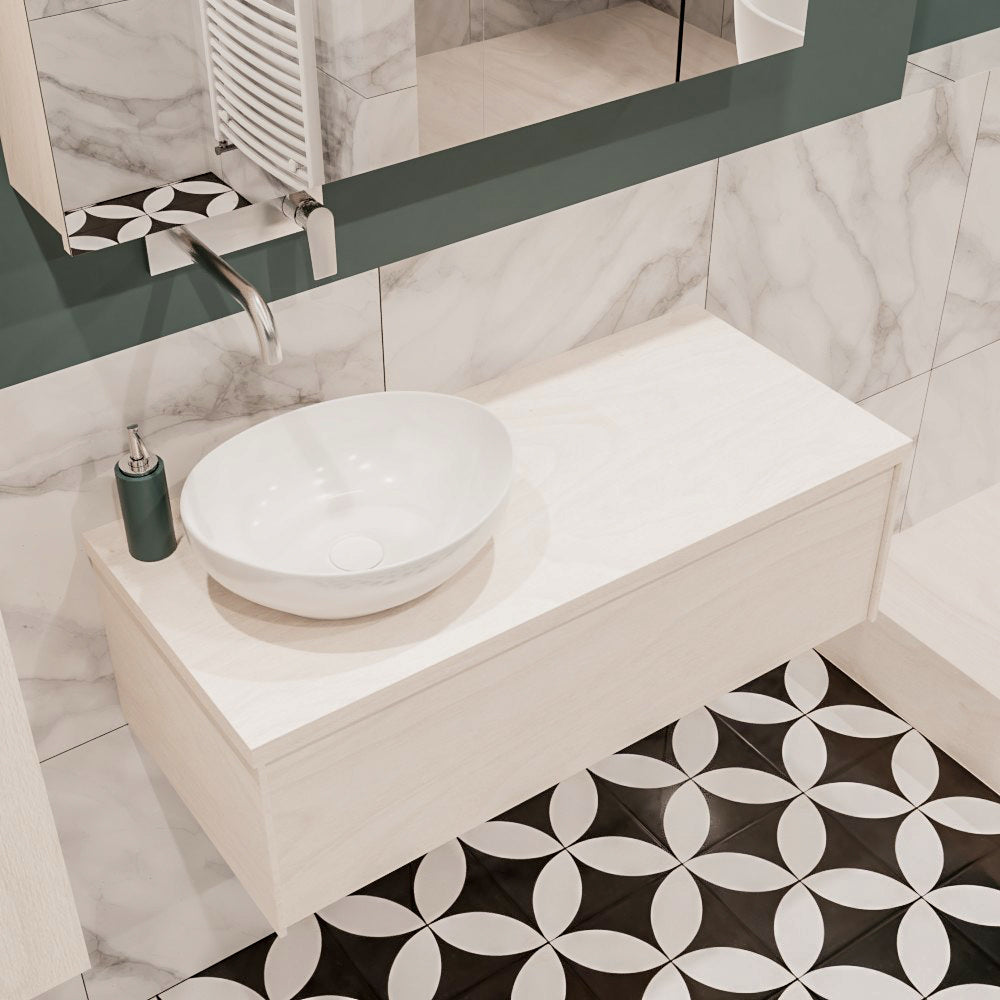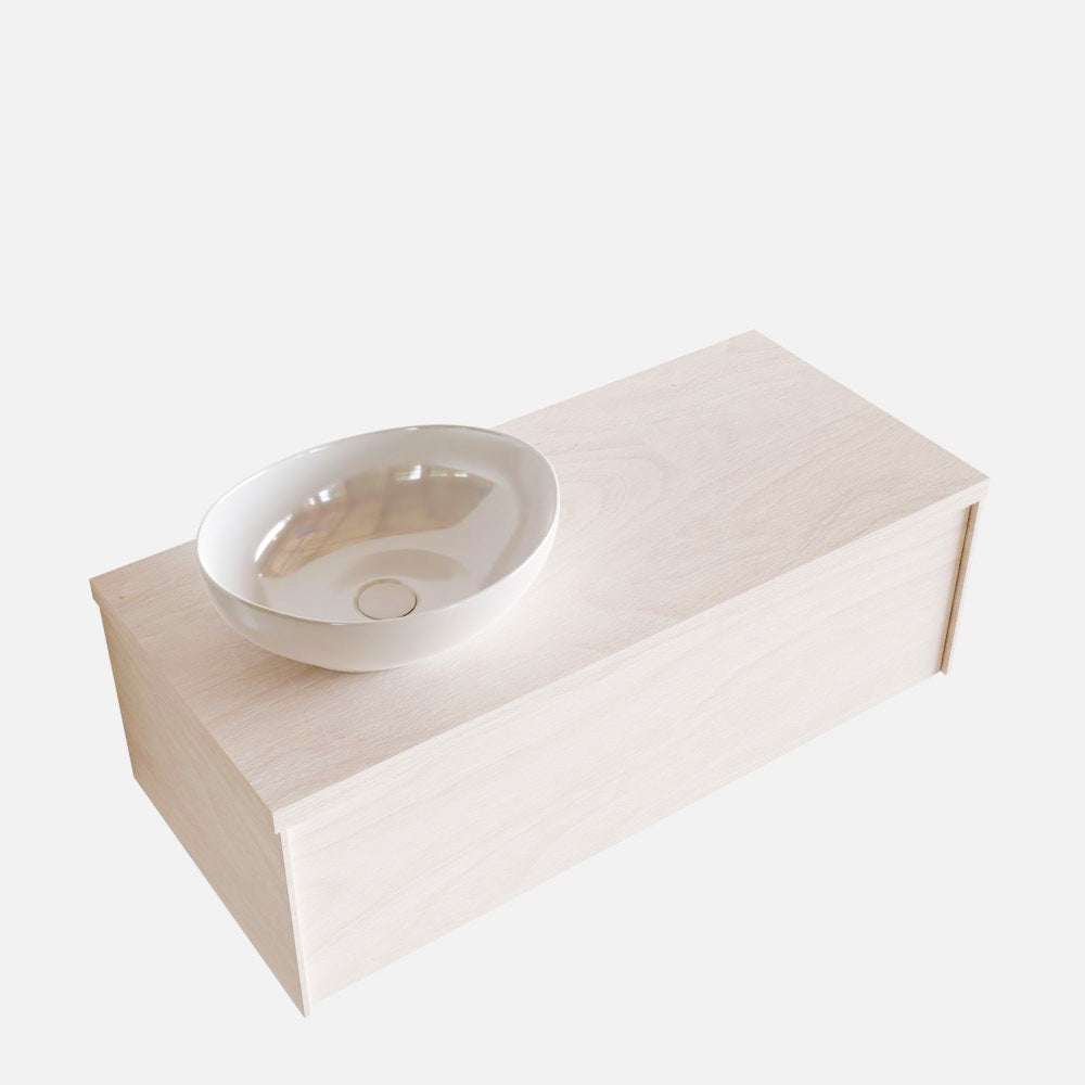 De LUSH meubelset is verkrijgbaar in 4 prachtige melamine kleuren, die een warme en natuurlijke uitstraling toevoegen aan je badkamer. In de LUSH serie heb je de keuze tussen 1 of 2 lades en kun je kiezen tussen een wastafel of waskom. Daarnaast is het mogelijk om te kiezen voor wel of geen kraangat en de positie van de wastafel/waskom. Deze serie biedt daarmee veelzijdige opties om het badmeubel aan te passen aan jouw specifieke behoeften en smaak.