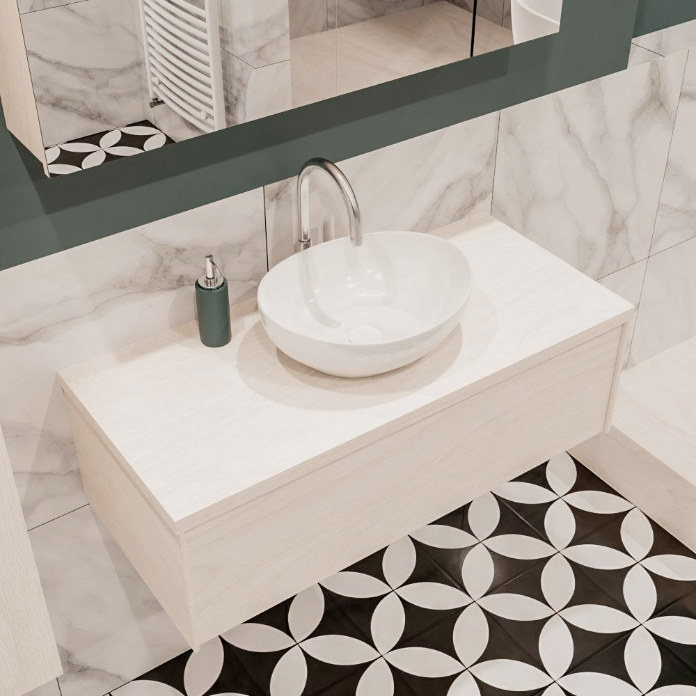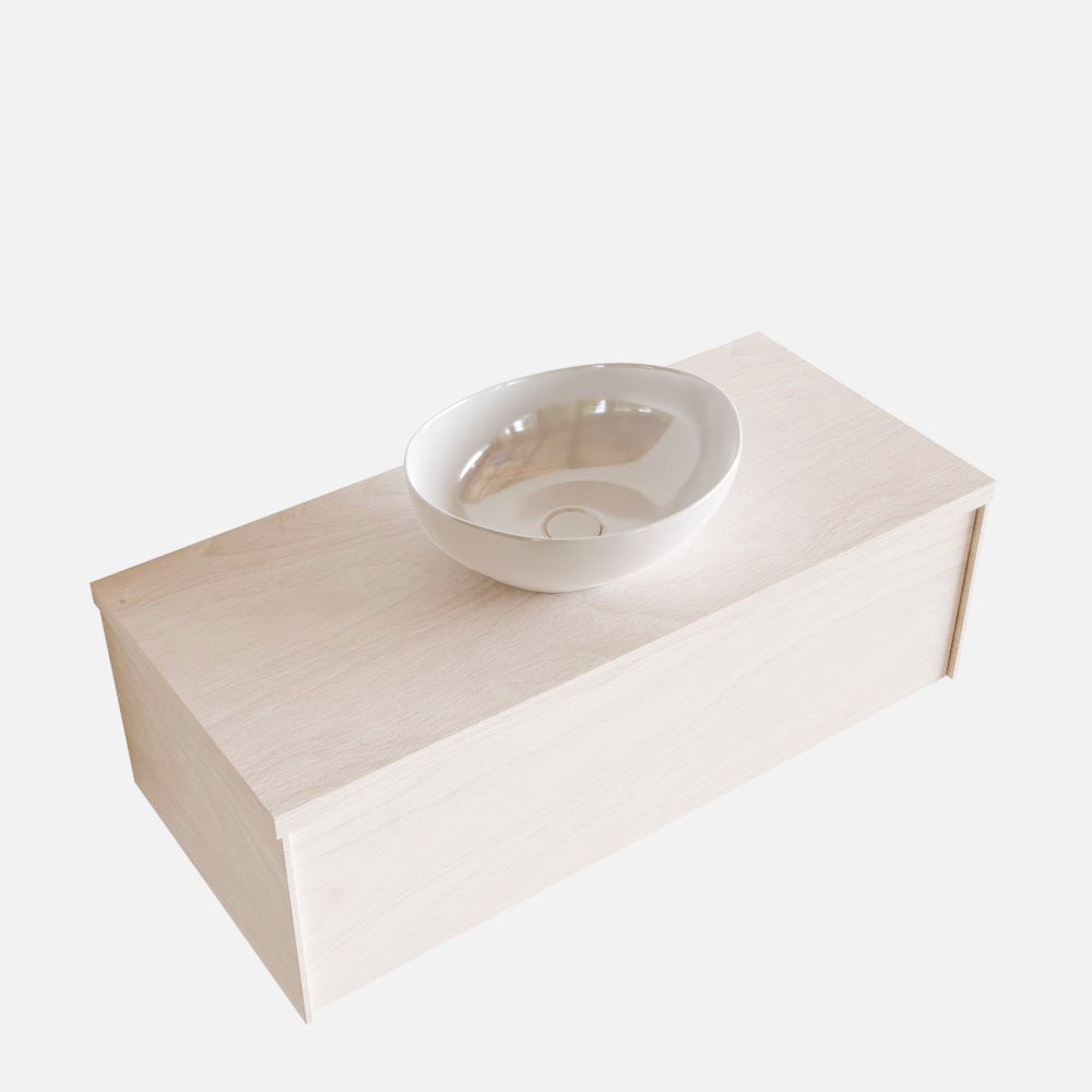 De LUSH meubelset is verkrijgbaar in 4 prachtige melamine kleuren, die een warme en natuurlijke uitstraling toevoegen aan je badkamer. In de LUSH serie heb je de keuze tussen 1 of 2 lades en kun je kiezen tussen een wastafel of waskom. Daarnaast is het mogelijk om te kiezen voor wel of geen kraangat en de positie van de wastafel/waskom. Deze serie biedt daarmee veelzijdige opties om het badmeubel aan te passen aan jouw specifieke behoeften en smaak.