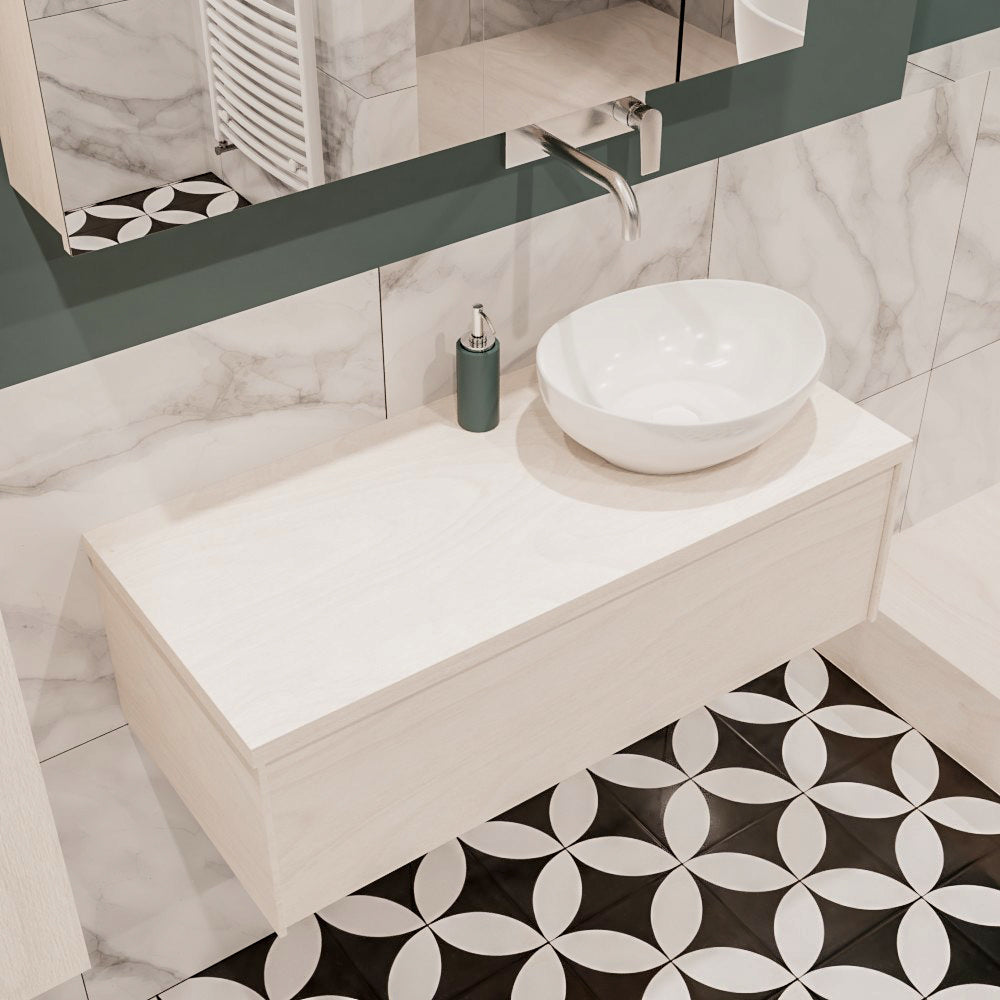 De LUSH meubelset is verkrijgbaar in 4 prachtige melamine kleuren, die een warme en natuurlijke uitstraling toevoegen aan je badkamer. In de LUSH serie heb je de keuze tussen 1 of 2 lades en kun je kiezen tussen een wastafel of waskom. Daarnaast is het mogelijk om te kiezen voor wel of geen kraangat en de positie van de wastafel/waskom. Deze serie biedt daarmee veelzijdige opties om het badmeubel aan te passen aan jouw specifieke behoeften en smaak.