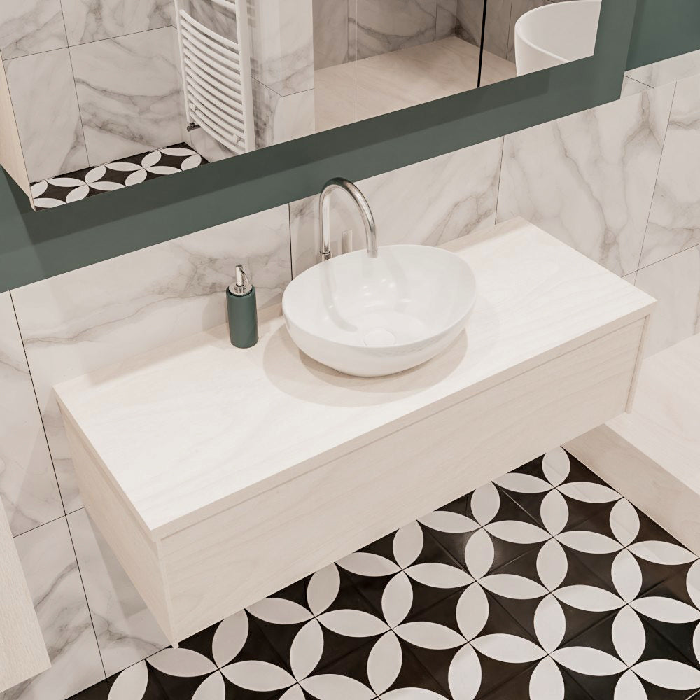 De LUSH meubelset is verkrijgbaar in 4 prachtige melamine kleuren, die een warme en natuurlijke uitstraling toevoegen aan je badkamer. In de LUSH serie heb je de keuze tussen 1 of 2 lades en kun je kiezen tussen een wastafel of waskom. Daarnaast is het mogelijk om te kiezen voor wel of geen kraangat en de positie van de wastafel/waskom. Deze serie biedt daarmee veelzijdige opties om het badmeubel aan te passen aan jouw specifieke behoeften en smaak.