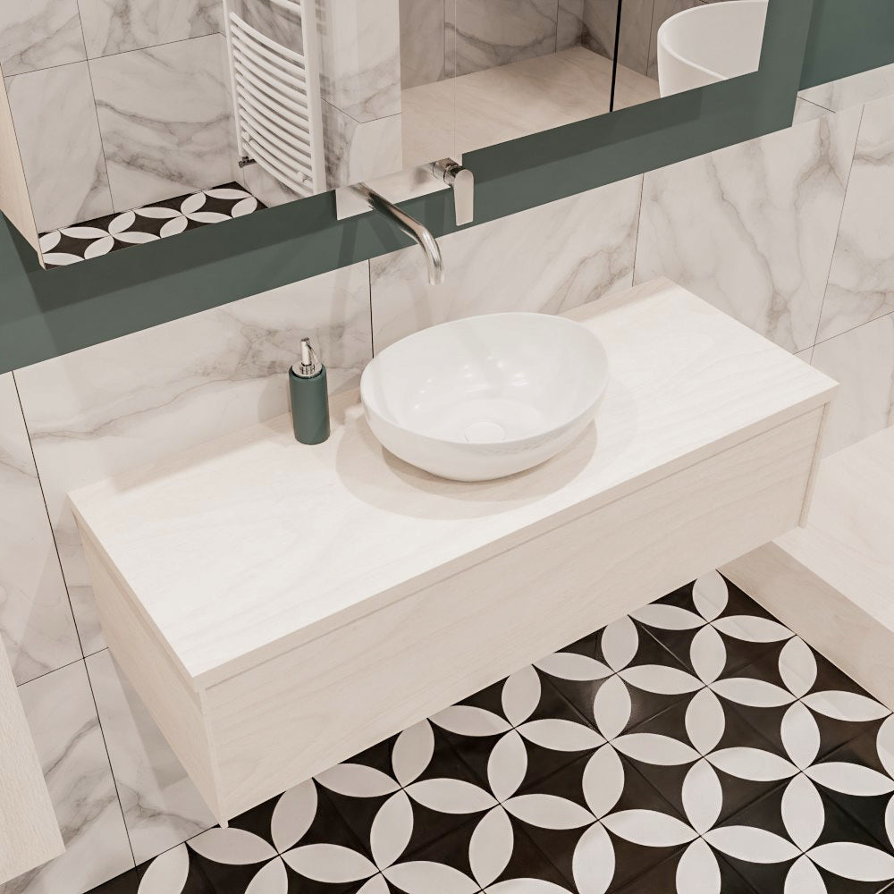 De LUSH meubelset is verkrijgbaar in 4 prachtige melamine kleuren, die een warme en natuurlijke uitstraling toevoegen aan je badkamer. In de LUSH serie heb je de keuze tussen 1 of 2 lades en kun je kiezen tussen een wastafel of waskom. Daarnaast is het mogelijk om te kiezen voor wel of geen kraangat en de positie van de wastafel/waskom. Deze serie biedt daarmee veelzijdige opties om het badmeubel aan te passen aan jouw specifieke behoeften en smaak.