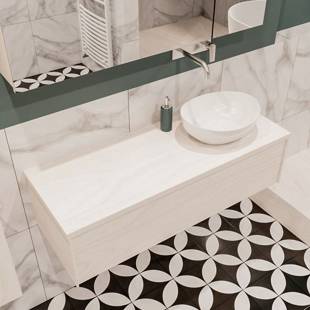 De LUSH meubelset is verkrijgbaar in 4 prachtige melamine kleuren, die een warme en natuurlijke uitstraling toevoegen aan je badkamer. In de LUSH serie heb je de keuze tussen 1 of 2 lades en kun je kiezen tussen een wastafel of waskom. Daarnaast is het mogelijk om te kiezen voor wel of geen kraangat en de positie van de wastafel/waskom. Deze serie biedt daarmee veelzijdige opties om het badmeubel aan te passen aan jouw specifieke behoeften en smaak.