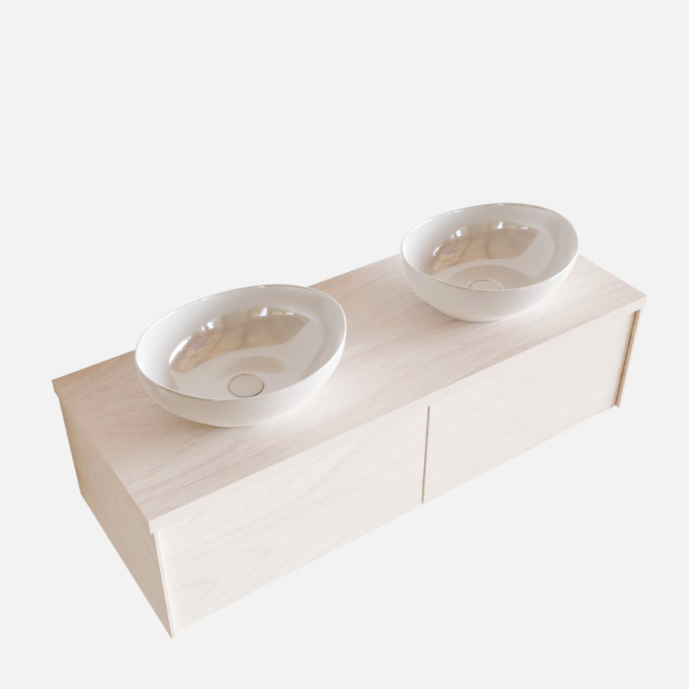 De LUSH meubelset is verkrijgbaar in 4 prachtige melamine kleuren, die een warme en natuurlijke uitstraling toevoegen aan je badkamer. In de LUSH serie heb je de keuze tussen 1 of 2 lades en kun je kiezen tussen een wastafel of waskom. Daarnaast is het mogelijk om te kiezen voor wel of geen kraangat en de positie van de wastafel/waskom. Deze serie biedt daarmee veelzijdige opties om het badmeubel aan te passen aan jouw specifieke behoeften en smaak.