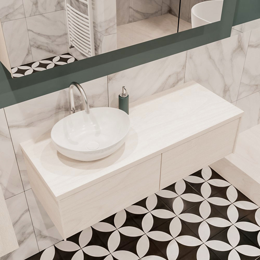De LUSH meubelset is verkrijgbaar in 4 prachtige melamine kleuren, die een warme en natuurlijke uitstraling toevoegen aan je badkamer. In de LUSH serie heb je de keuze tussen 1 of 2 lades en kun je kiezen tussen een wastafel of waskom. Daarnaast is het mogelijk om te kiezen voor wel of geen kraangat en de positie van de wastafel/waskom. Deze serie biedt daarmee veelzijdige opties om het badmeubel aan te passen aan jouw specifieke behoeften en smaak.