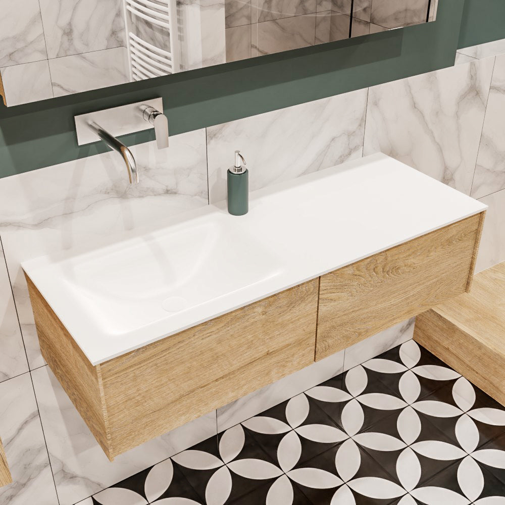 MONDIAZ LUSH 120 badmeubel washed oak 2 lades wastafel links geen kraangat