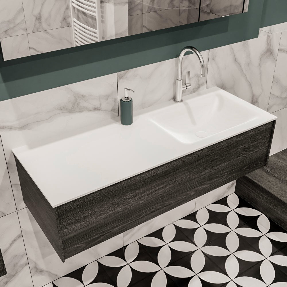 De LUSH meubelset is verkrijgbaar in 4 prachtige melamine kleuren, die een warme en natuurlijke uitstraling toevoegen aan je badkamer. In de LUSH serie heb je de keuze tussen 1 of 2 lades en kun je kiezen tussen een wastafel of waskom. Daarnaast is het mogelijk om te kiezen voor wel of geen kraangat en de positie van de wastafel/waskom. Deze serie biedt daarmee veelzijdige opties om het badmeubel aan te passen aan jouw specifieke behoeften en smaak.