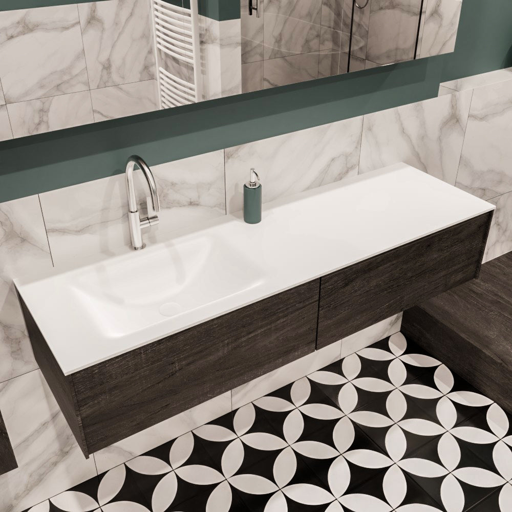 De LUSH meubelset is verkrijgbaar in 4 prachtige melamine kleuren, die een warme en natuurlijke uitstraling toevoegen aan je badkamer. In de LUSH serie heb je de keuze tussen 1 of 2 lades en kun je kiezen tussen een wastafel of waskom. Daarnaast is het mogelijk om te kiezen voor wel of geen kraangat en de positie van de wastafel/waskom. Deze serie biedt daarmee veelzijdige opties om het badmeubel aan te passen aan jouw specifieke behoeften en smaak.