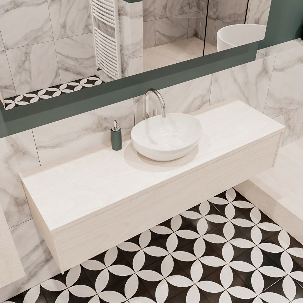 De LUSH meubelset is verkrijgbaar in 4 prachtige melamine kleuren, die een warme en natuurlijke uitstraling toevoegen aan je badkamer. In de LUSH serie heb je de keuze tussen 1 of 2 lades en kun je kiezen tussen een wastafel of waskom. Daarnaast is het mogelijk om te kiezen voor wel of geen kraangat en de positie van de wastafel/waskom. Deze serie biedt daarmee veelzijdige opties om het badmeubel aan te passen aan jouw specifieke behoeften en smaak.