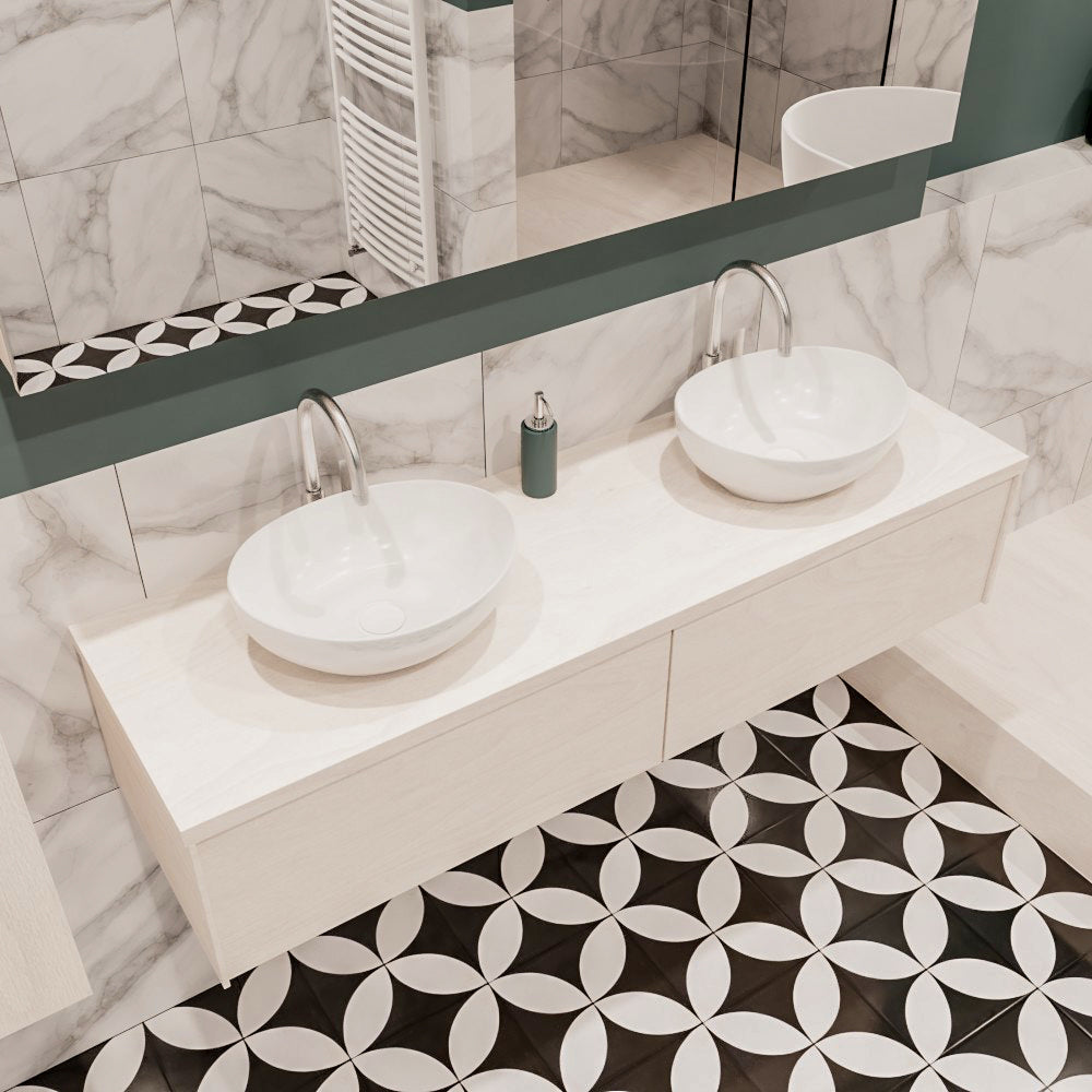 De LUSH meubelset is verkrijgbaar in 4 prachtige melamine kleuren, die een warme en natuurlijke uitstraling toevoegen aan je badkamer. In de LUSH serie heb je de keuze tussen 1 of 2 lades en kun je kiezen tussen een wastafel of waskom. Daarnaast is het mogelijk om te kiezen voor wel of geen kraangat en de positie van de wastafel/waskom. Deze serie biedt daarmee veelzijdige opties om het badmeubel aan te passen aan jouw specifieke behoeften en smaak.