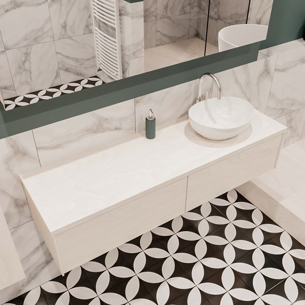De LUSH meubelset is verkrijgbaar in 4 prachtige melamine kleuren, die een warme en natuurlijke uitstraling toevoegen aan je badkamer. In de LUSH serie heb je de keuze tussen 1 of 2 lades en kun je kiezen tussen een wastafel of waskom. Daarnaast is het mogelijk om te kiezen voor wel of geen kraangat en de positie van de wastafel/waskom. Deze serie biedt daarmee veelzijdige opties om het badmeubel aan te passen aan jouw specifieke behoeften en smaak.