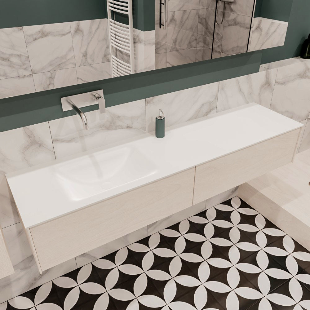 De LUSH meubelset is verkrijgbaar in 4 prachtige melamine kleuren, die een warme en natuurlijke uitstraling toevoegen aan je badkamer. In de LUSH serie heb je de keuze tussen 1 of 2 lades en kun je kiezen tussen een wastafel of waskom. Daarnaast is het mogelijk om te kiezen voor wel of geen kraangat en de positie van de wastafel/waskom. Deze serie biedt daarmee veelzijdige opties om het badmeubel aan te passen aan jouw specifieke behoeften en smaak.