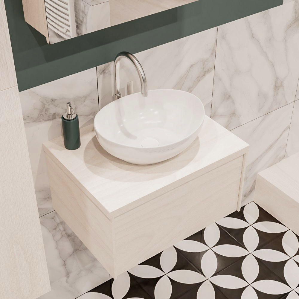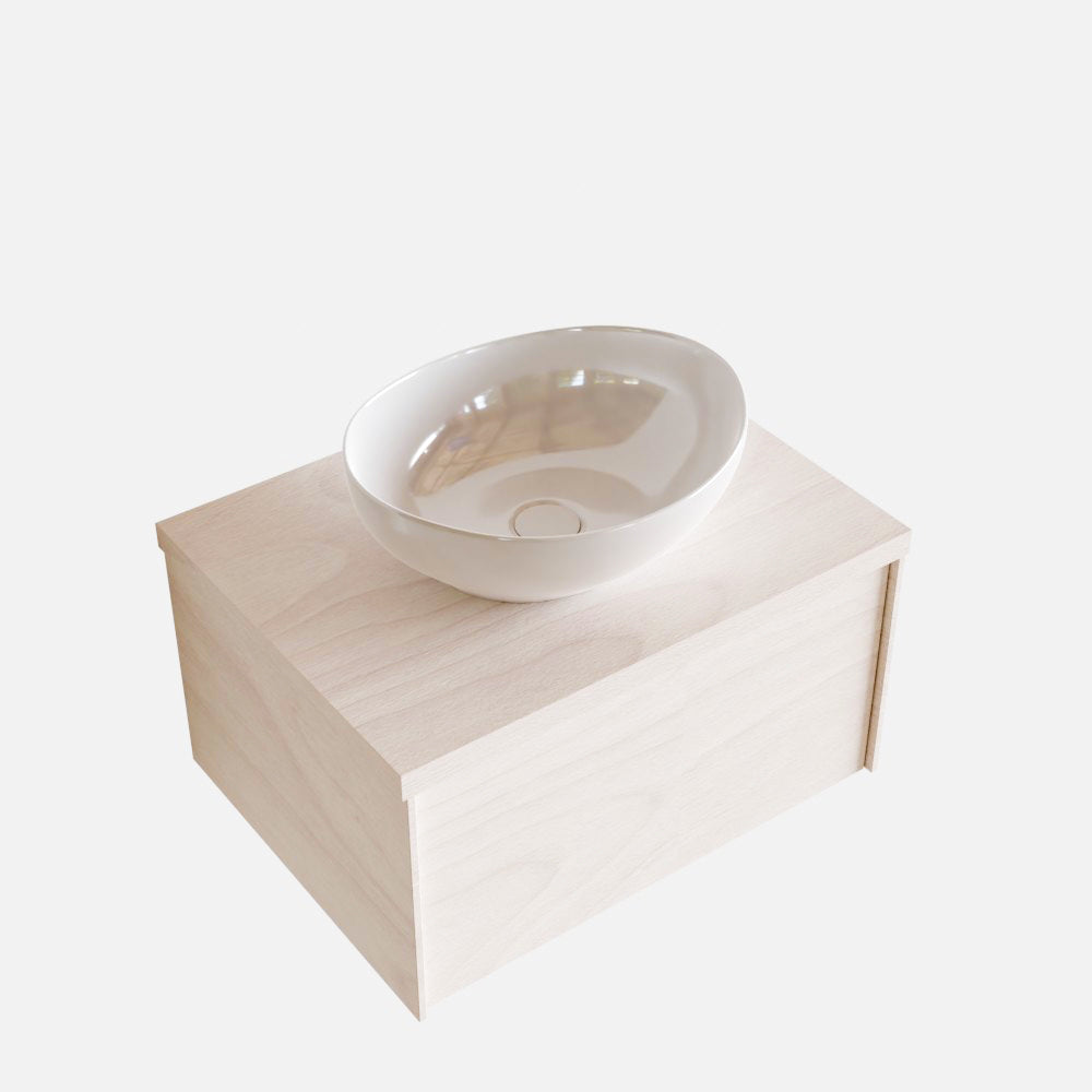 De LUSH meubelset is verkrijgbaar in 4 prachtige melamine kleuren, die een warme en natuurlijke uitstraling toevoegen aan je badkamer. In de LUSH serie heb je de keuze tussen 1 of 2 lades en kun je kiezen tussen een wastafel of waskom. Daarnaast is het mogelijk om te kiezen voor wel of geen kraangat en de positie van de wastafel/waskom. Deze serie biedt daarmee veelzijdige opties om het badmeubel aan te passen aan jouw specifieke behoeften en smaak.