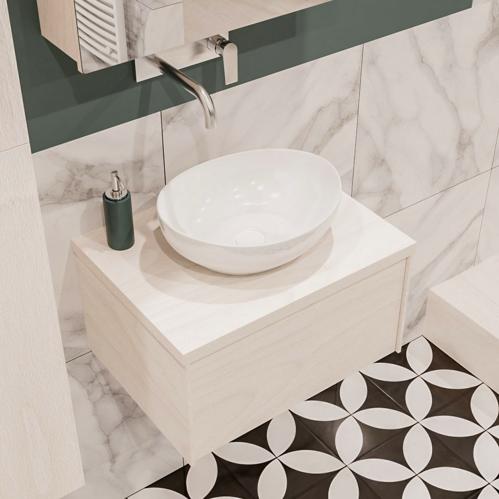 De LUSH meubelset is verkrijgbaar in 4 prachtige melamine kleuren, die een warme en natuurlijke uitstraling toevoegen aan je badkamer. In de LUSH serie heb je de keuze tussen 1 of 2 lades en kun je kiezen tussen een wastafel of waskom. Daarnaast is het mogelijk om te kiezen voor wel of geen kraangat en de positie van de wastafel/waskom. Deze serie biedt daarmee veelzijdige opties om het badmeubel aan te passen aan jouw specifieke behoeften en smaak.