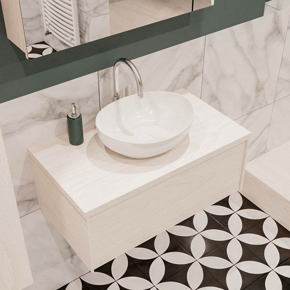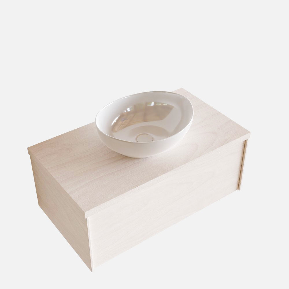 De LUSH meubelset is verkrijgbaar in 4 prachtige melamine kleuren, die een warme en natuurlijke uitstraling toevoegen aan je badkamer. In de LUSH serie heb je de keuze tussen 1 of 2 lades en kun je kiezen tussen een wastafel of waskom. Daarnaast is het mogelijk om te kiezen voor wel of geen kraangat en de positie van de wastafel/waskom. Deze serie biedt daarmee veelzijdige opties om het badmeubel aan te passen aan jouw specifieke behoeften en smaak.