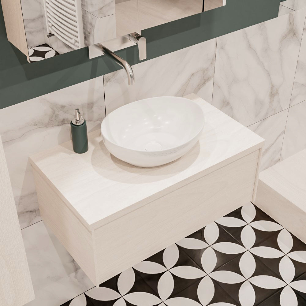 De LUSH meubelset is verkrijgbaar in 4 prachtige melamine kleuren, die een warme en natuurlijke uitstraling toevoegen aan je badkamer. In de LUSH serie heb je de keuze tussen 1 of 2 lades en kun je kiezen tussen een wastafel of waskom. Daarnaast is het mogelijk om te kiezen voor wel of geen kraangat en de positie van de wastafel/waskom. Deze serie biedt daarmee veelzijdige opties om het badmeubel aan te passen aan jouw specifieke behoeften en smaak.