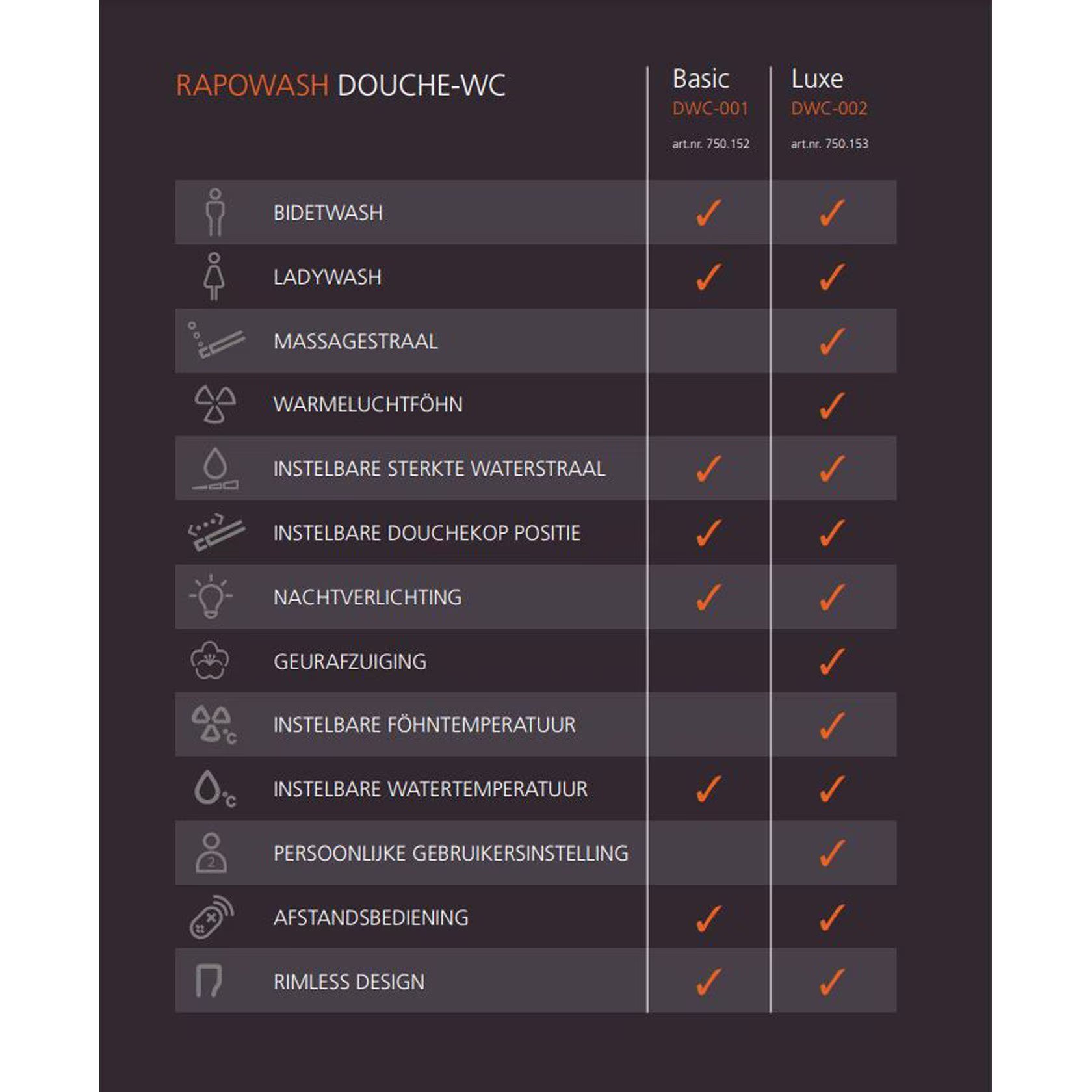 De RapoWash Basic is een zeer complete douche-wc. Met een comfortabele warme waterstraal reinigt de RapoWash Basic het onderlichaam. Met de meegeleverde afstandsbediening kunt u alle wellnessfuncties bedienen. Hiermee kan eenvoudig de temperatuur, positie en sterkte van de waterstraal ingesteld worden. De standaard nachtverlichting geeft de RapoWash Basic net die extra luxe uitstraling.